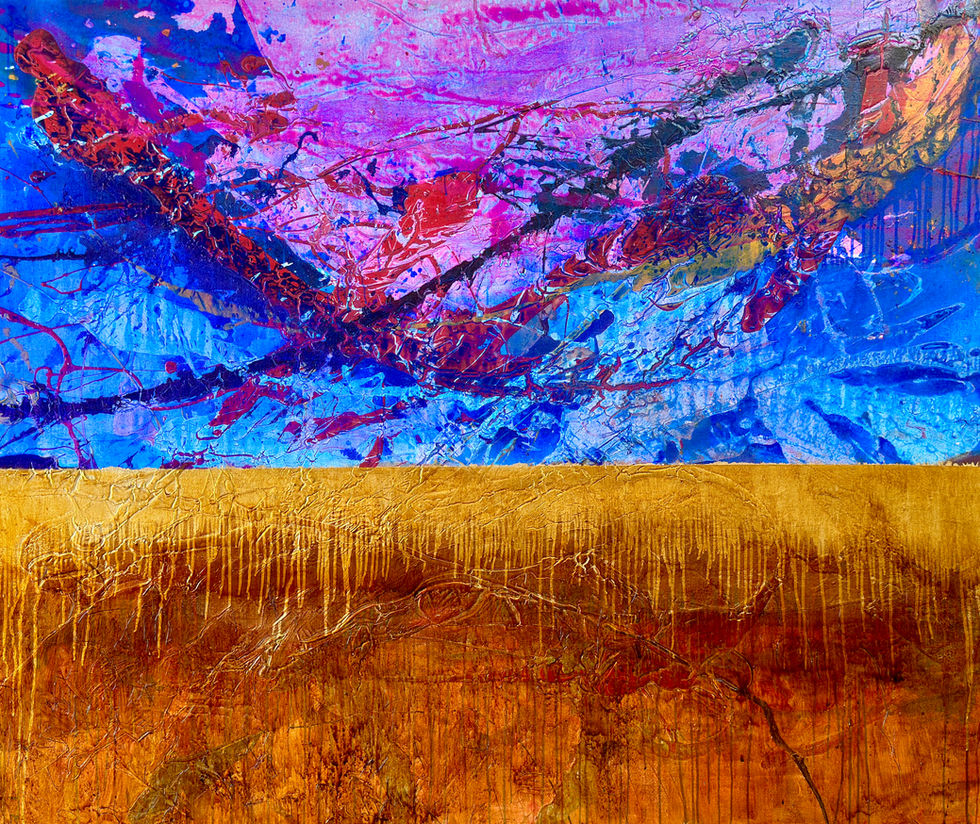 Acrylic, Gold Leaf, Antique Medium Powder, Pigment Powder, and Enamel on Canvas